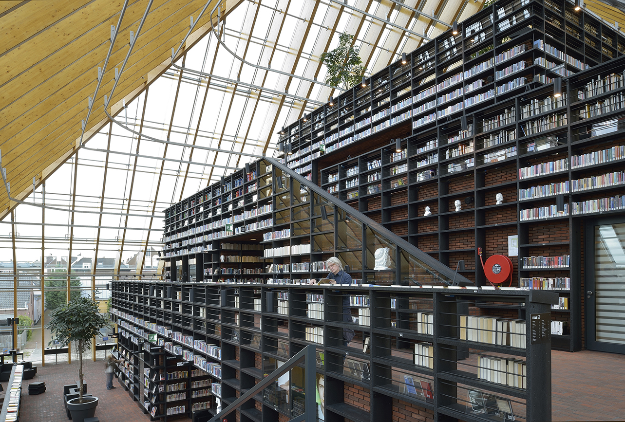 館内の本の山の山頂からは、周辺の街並みが一望できるほか、ガラスや木、頑丈な鉄骨が織りなす建屋の構造美を間近に見ることもできる。