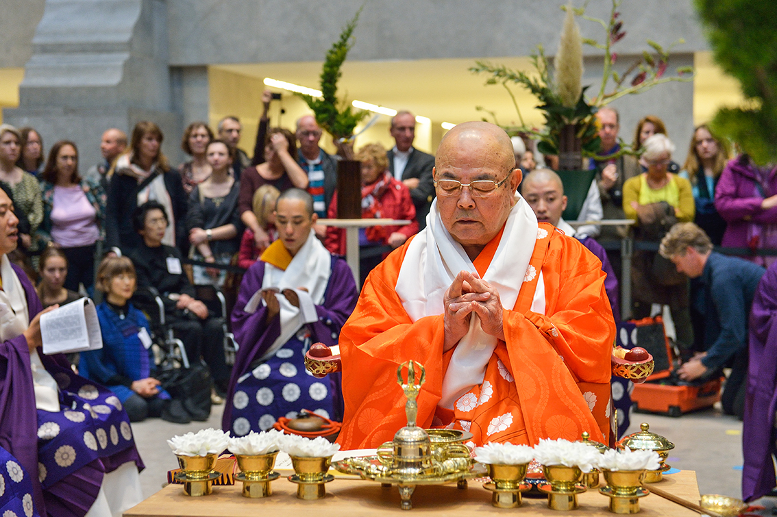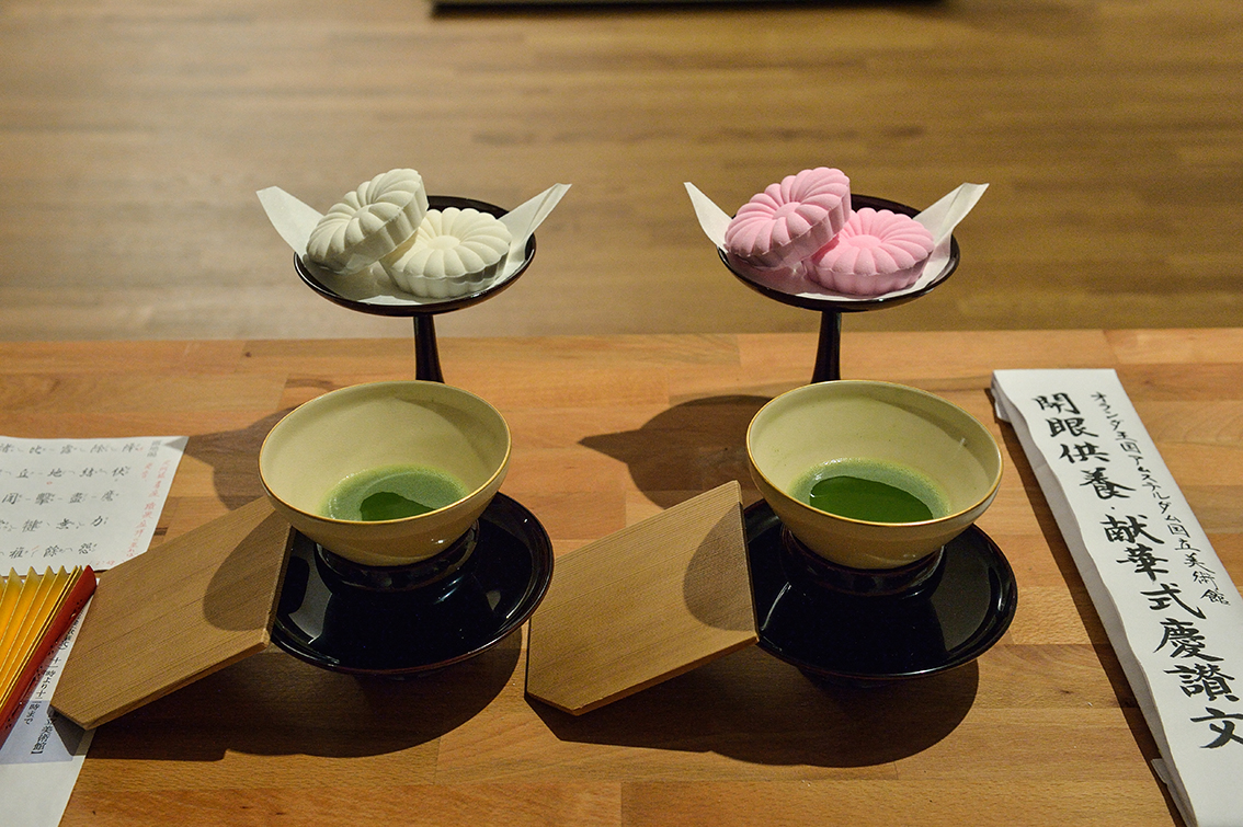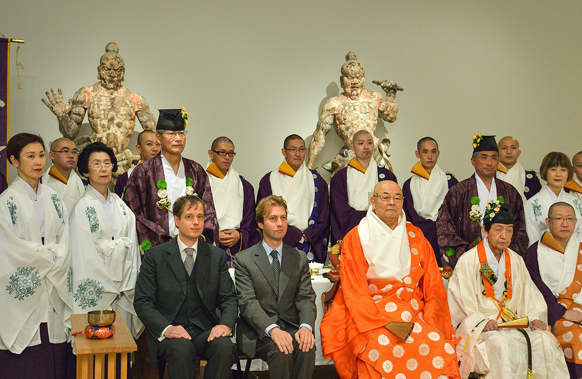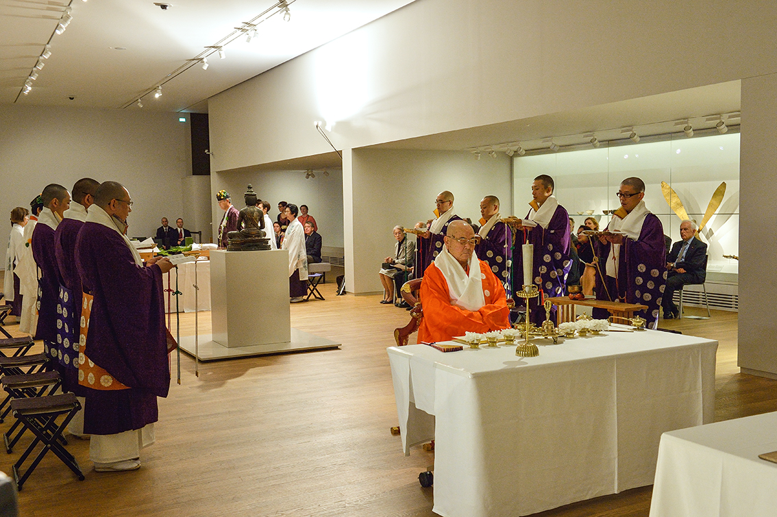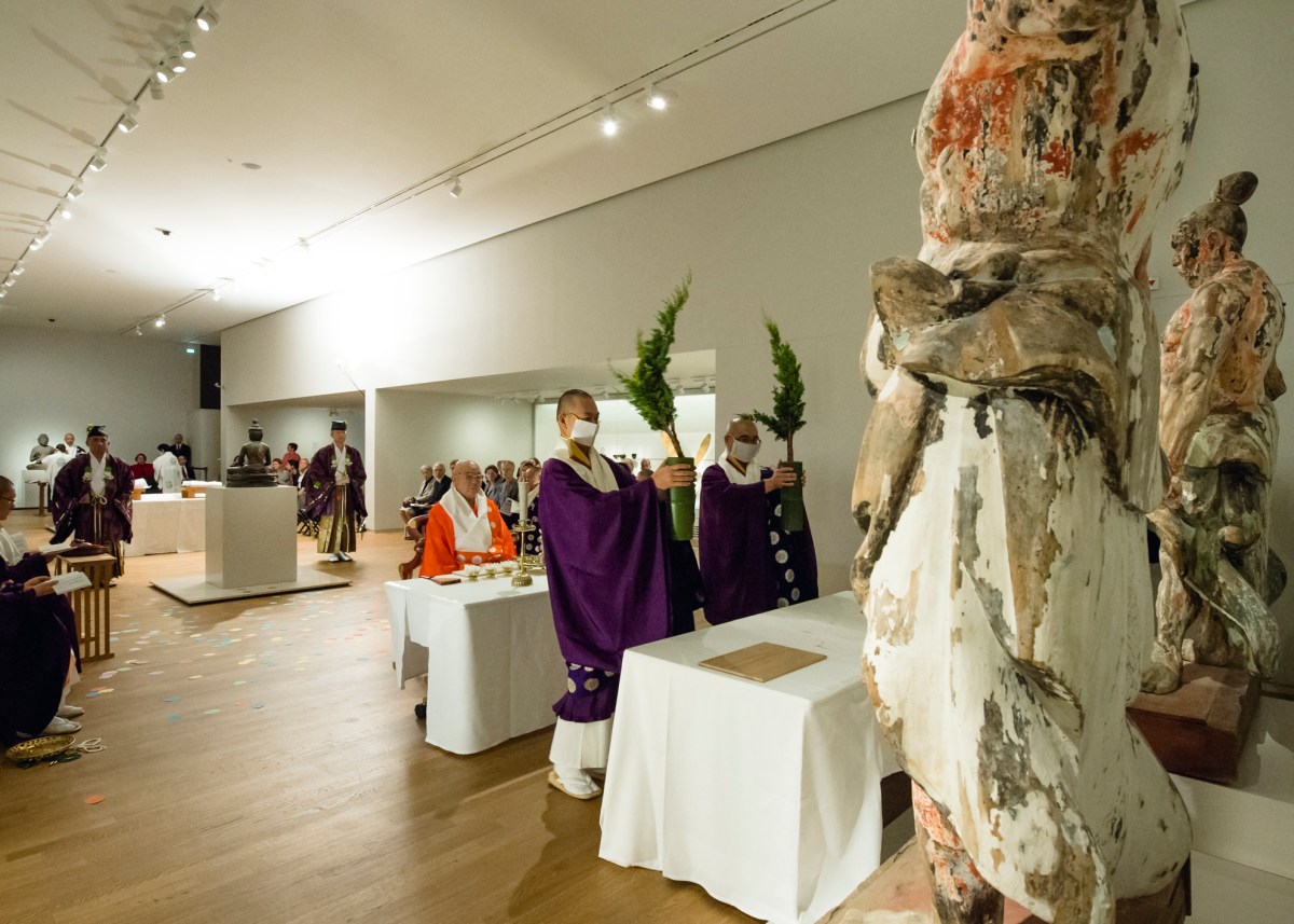 厳かな儀式の場に様変わりした展示ギャラリーに、鮮やかな装束をまとった京都大覚寺の僧侶の読経が響いた。