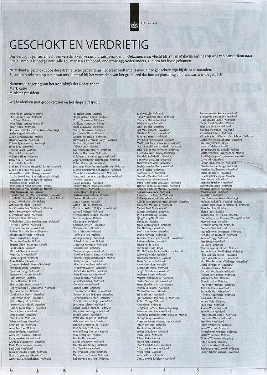 今日の全ての全国紙に、オランダ政府による1ページ大の死亡広告が掲載されていた(写真下)。亡くなった298人全員の名前と国籍が記載されている。そこかしこに同じ名字が3つ、4つ連なる部分があり、複数の家族を一度に失った遺族も多いことを物語っている。