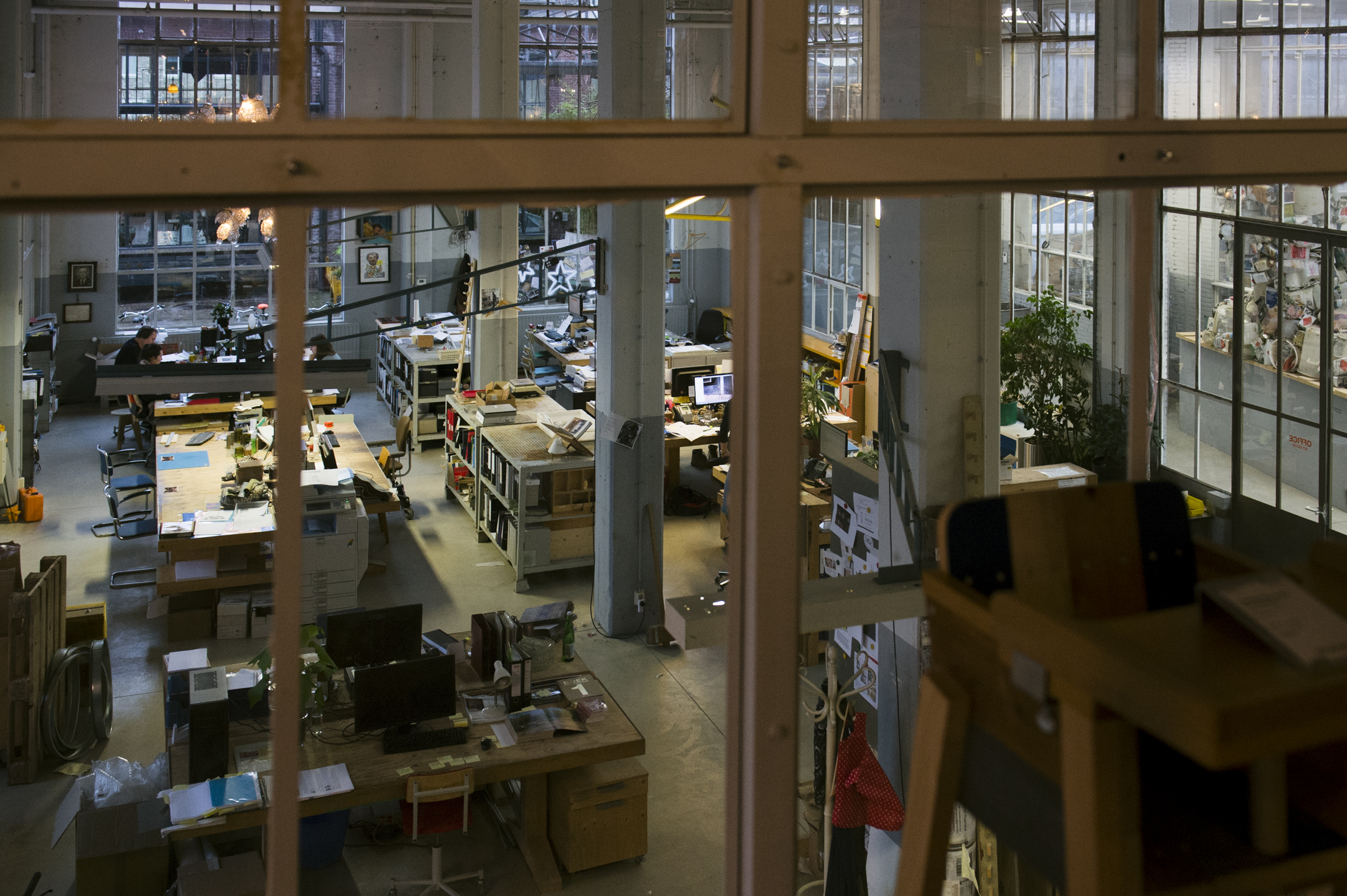 ショップ2階からは、工房やオフィスが一望できるつくりになっていて、真剣にスケッチを描くピートの後ろ姿も丸見え・・・・